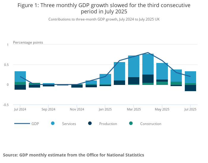 Real gross domestic product (GDP) grew by 0.2% in the three months to July 2025 compared with the three months to April 2025, down from three-month-on-three-month growths of 0.3% in June 2025 and 0.6% in May 2025.