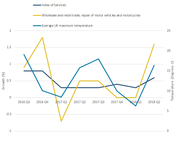 .png (20.2 kB) .xlsx (24.2 kB)Services industries experienced robust growth of 0.5% in Quarter 2 (Apr to June) 2018. This was driven by strong growth in wholesale and retail trade of 1.6% (contributing 0.16 percentage points). Within this, retail trade growth was particularly strong (2.1%), as a result of the warm weather seen in this quarter (see Retail sales bulletin). This growth was also due partially to a bounce back from weaker growth in Quarter 1 (Jan to Mar) 2018. Figure 5 shows the strong relationship between retail sales growth and average UK maximum temperature.