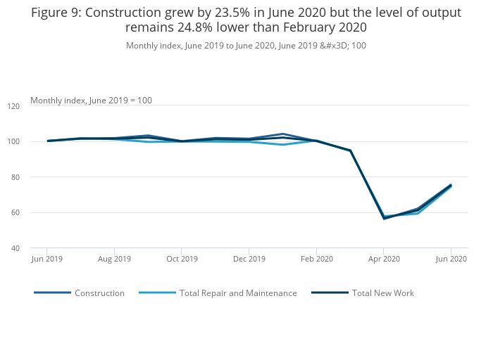 Figure 9: Construction grew by 23.5% in June 2020 but the level of output remains 24.8% lower than February 2020