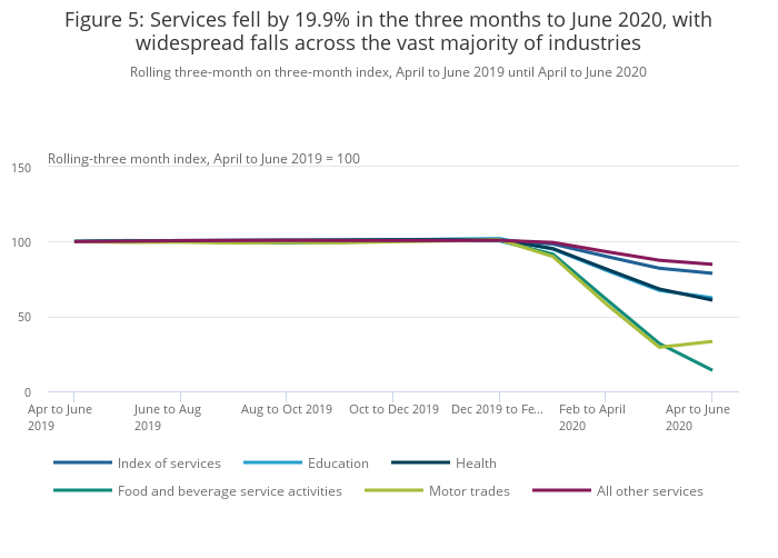 - The services sector fell by 19.9% in Quarter 2 (Apr to June) 2020