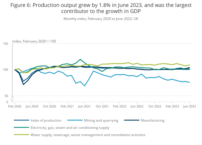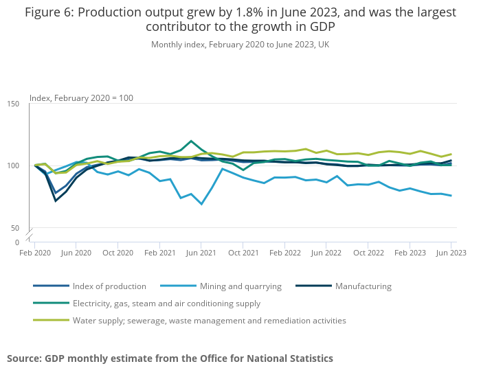 Production output grew by 1.8% in June 2023 after a fall of 0.6% in May 2023, unrevised from the previous publication; this sector was the main contributor to the growth in monthly GDP in June.