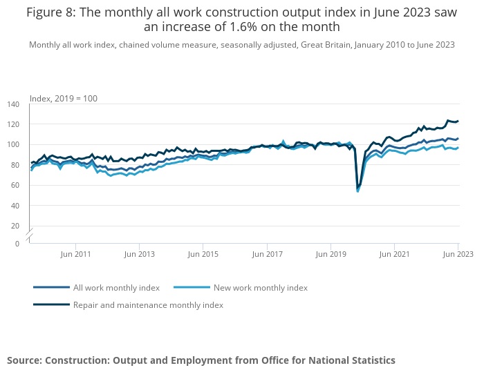 Monthly construction output is estimated to have increased 1.6% in volume terms in June 2023; this came from increases in both new work (2.0%) and repair and maintenance (1.1%) on the month.
