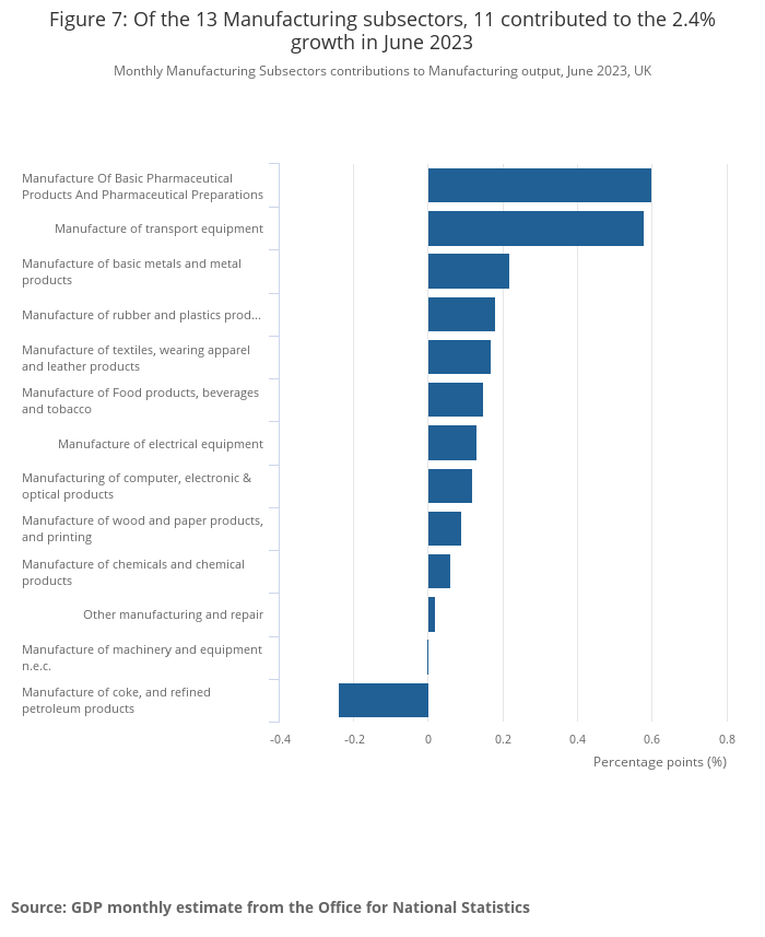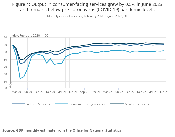 Looking at the broader picture, GDP has shown 0.2% growth in the three months to June 2023.