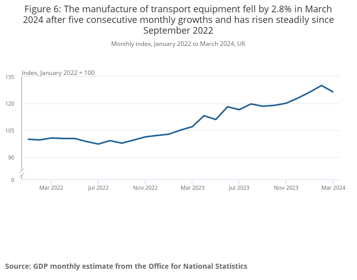 Figure 6: The manufacture of transport equipment fell by 2.8% in March 2024 after five consecutive monthly growths and has risen steadily since September 2022