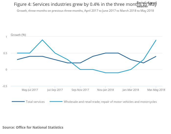 This industry grew by 0.9% in the three months to May and contributed 0.1 percentage points to headline GDP. This was driven by high growth in the months of April and May, with the latter relating to the good weather seen at the time, as reported in Retail sales, Great Britain: May 2018.