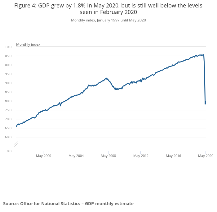 "Manufacturing and house building showed signs of recovery as some businesses saw staff return to work. Despite this, the economy was still a quarter smaller in May than in February, before the full effects of the pandemic struck.