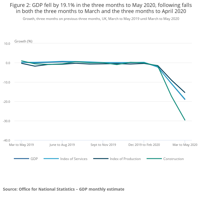 - UK GDP fell by 19.1% in the three months to May 2020
