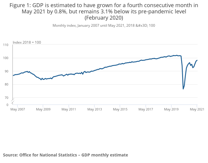 This release captures the direct effects of the coronavirus (COVID-19) pandemic and the government measures taken to reduce transmission of the virus. We have faced an increased number of challenges in producing estimates of UK gross domestic product (GDP) and because of these challenges, GDP estimates for May 2021 are subject to more uncertainty than usual.