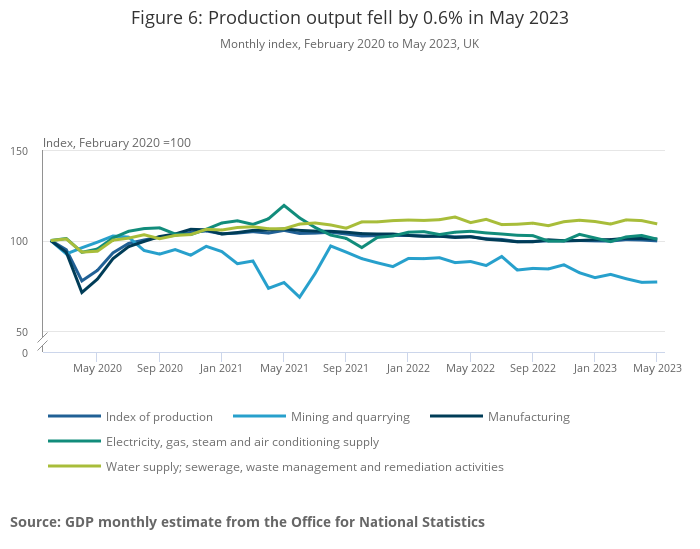 Production output fell by 0.6% in May 2023 after a fall of 0.2% in April 2023, revised up from a fall of 0.3% in the previous publication; this sector was the main contributor to the fall in monthly GDP in May.