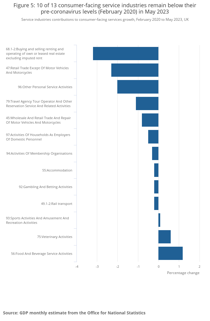 Figure 5: 10 of 13 consumer-facing service industries remain below their pre-coronavirus levels (February 2020) in May 2023