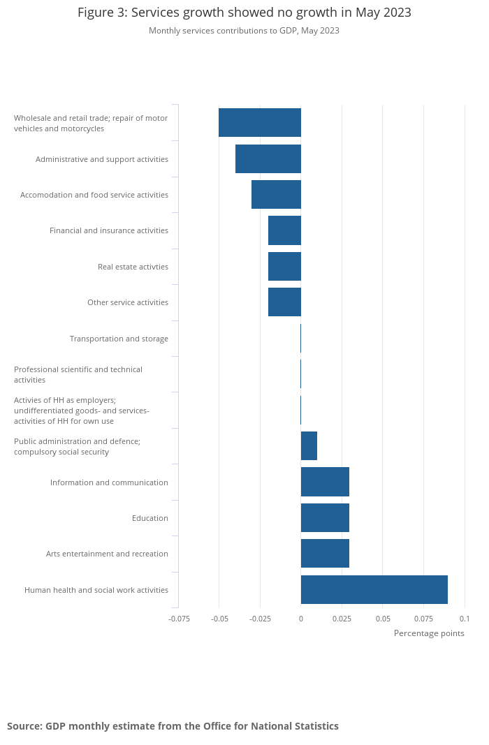 Looking at the broader picture, GDP has shown no growth in the three months to May 2023.