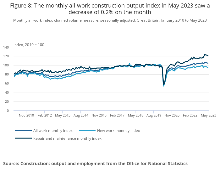 Image .csv .xlsFurther detail on construction output growth rates, along with new orders in the construction industry and construction output prices, can be found in our Construction output in Great Britain: May 2023 bulletin.