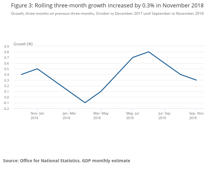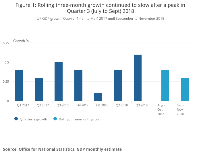 - UK gross domestic product (GDP) grew by 0.3% in the three months to November 2018