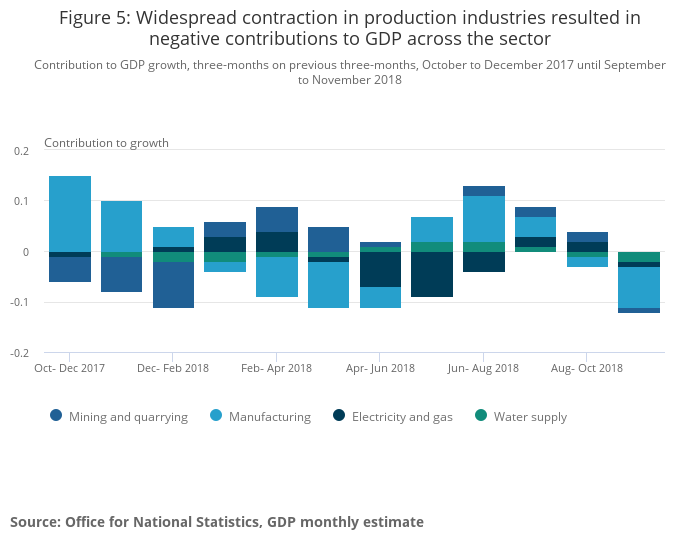 Nôl i'r tabl cynnwys6. The production sector experienced negative growth in the three months to November 2018, as all four of its subsectors contracted
