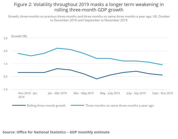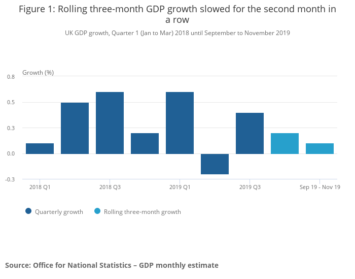 1. UK GDP grew by 0.1% in the three months to November 2019