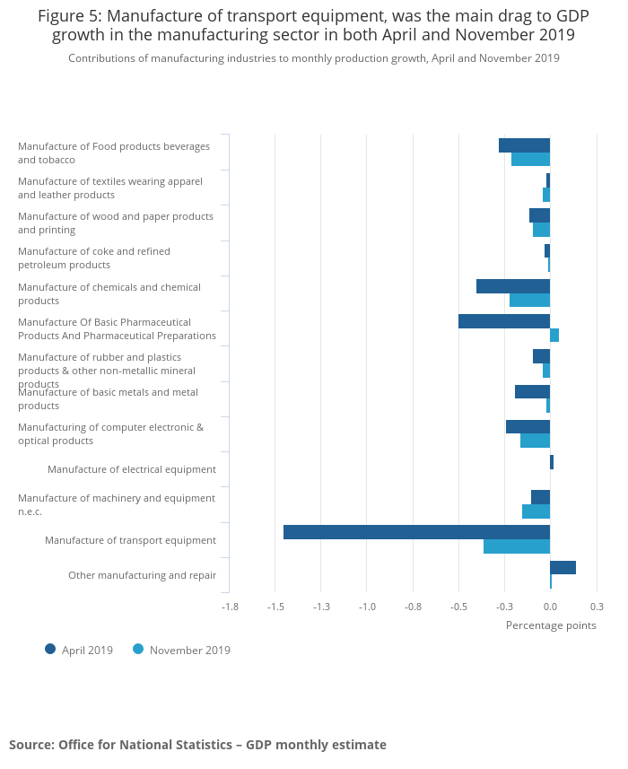 Figure 5: Manufacture of transport equipment, was the main drag to GDP growth in the manufacturing sector in both April and November 2019