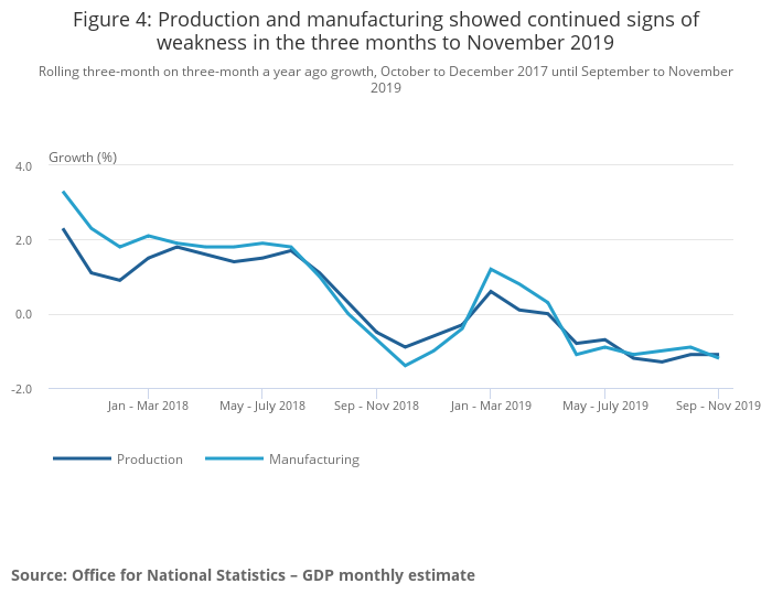 Download this chart Figure 4: Production and manufacturing showed continued signs of weakness in the three months to November 2019