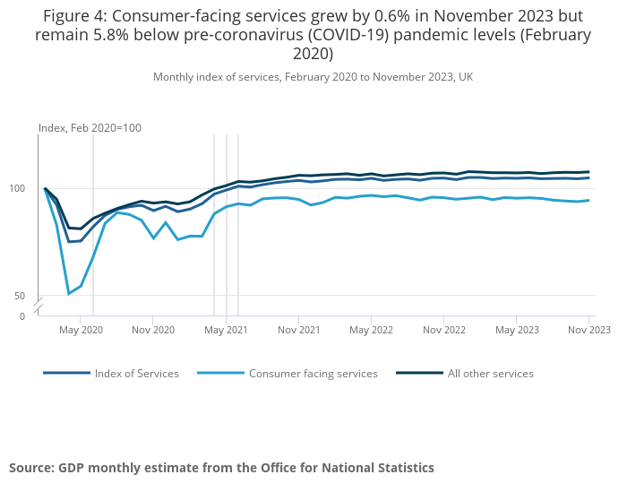 Figure 4: Consumer-facing services grew by 0.6% in November 2023 but remain 5.8% below pre-coronavirus (COVID-19) pandemic levels (February 2020)