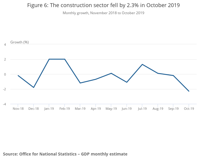 - Output in the construction industry fell by 0.3% in the three months to October 2019