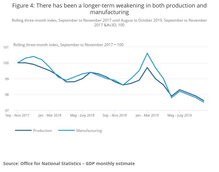 Image .csv .xlsThe production sector fell by 0.7% in the three months to October 2019, with widespread falls across several manufacturing industries. Figure 4 shows there has been a longer-term weakening in both production and manufacturing.