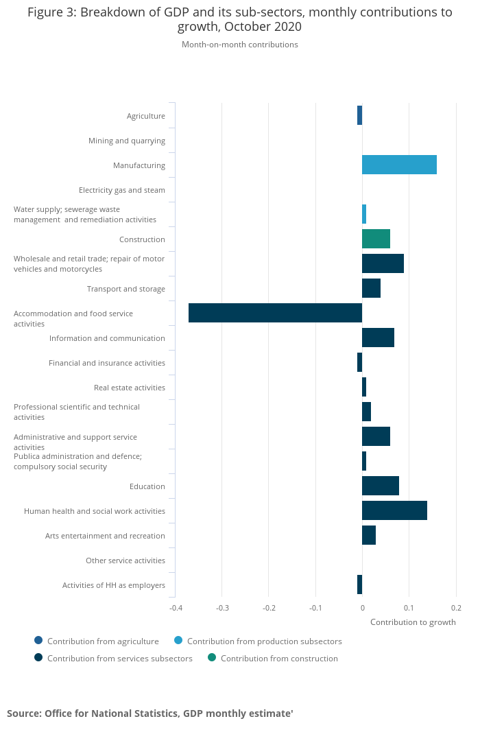 Image .csv .xlsMonthly GDP in October 2020 increased by 0.4%, where manufacturing had the largest contribution, as manufacturing of transport equipment saw increased demand. Health also had a large positive contribution in October as there was an increase in the volume of activity. Accommodation and food service activities acted as a large drag on growth in October as tightening coronavirus measures had an adverse impact on trade and a subsequent lack of demand.