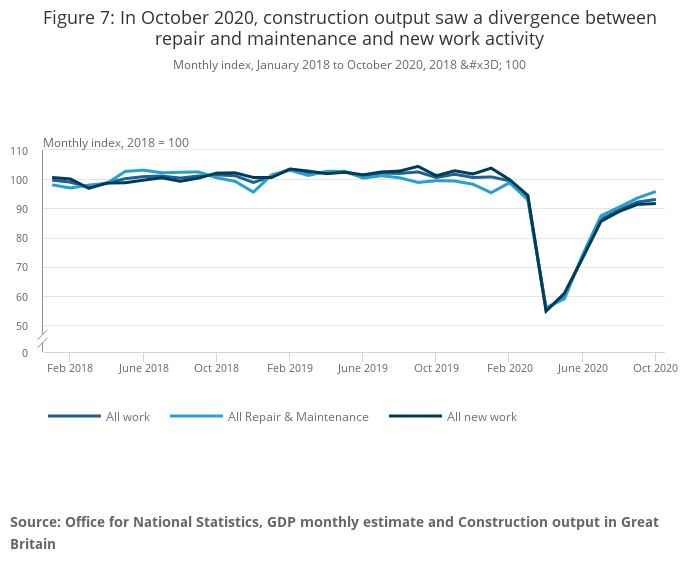 Figure 7: In October 2020, construction output saw a divergence between repair and maintenance and new work activity