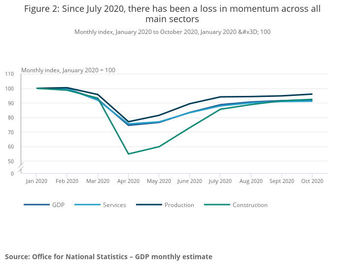 - The production sector grew by 1.3% in October 2020, however, it remains 4.4% lower than the level in February 2020
