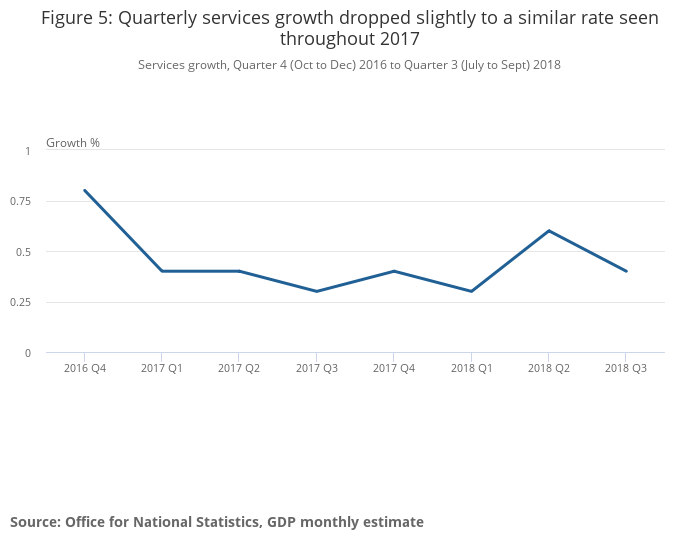 Nôl i'r tabl cynnwys5. The services sector grew by 0.4% in Quarter 3 2018, slightly lower than the 0.6% seen in Quarter 2