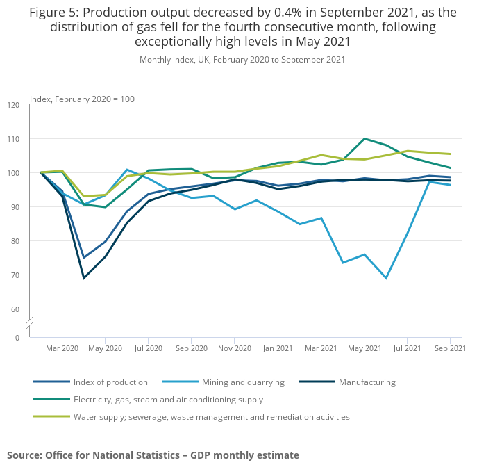 More detailed breakdowns on production are available in the Index of Production, UK: September 2021, while detail on the quarterly path can also be found in GDP first quarterly estimate, UK: July to September 2021.