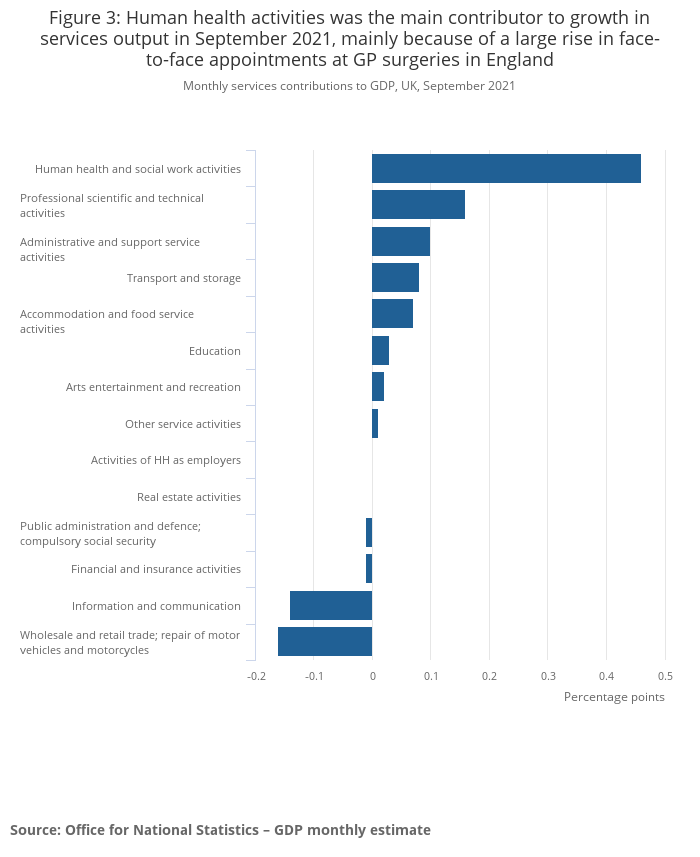 - Services output grew by 0.7% in September 2021 as human health activities grew by 6.4%, mainly because of a large rise in face-to-face appointments at GP surgeries in England.