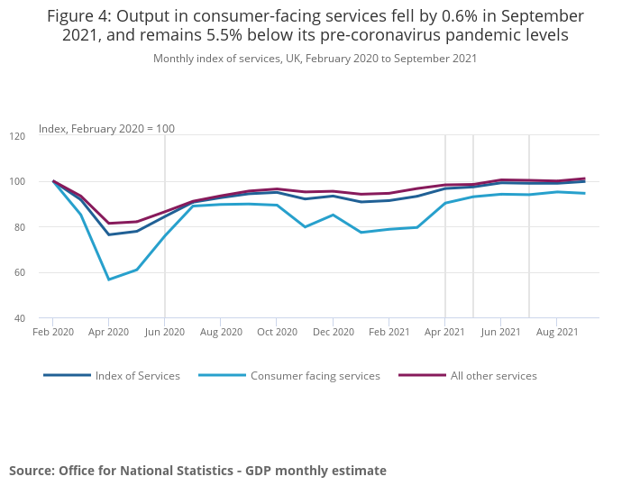 Figure 4: Output in consumer-facing services fell by 0.6% in September 2021, and remains 5.5% below its pre-coronavirus pandemic levels
