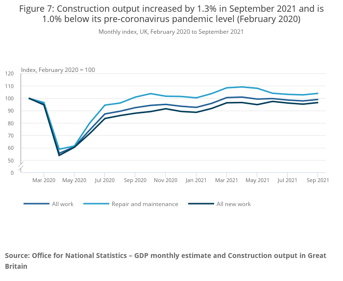 Figure 7: Construction output increased by 1.3% in September 2021 and is 1.0% below its pre-coronavirus pandemic level (February 2020)