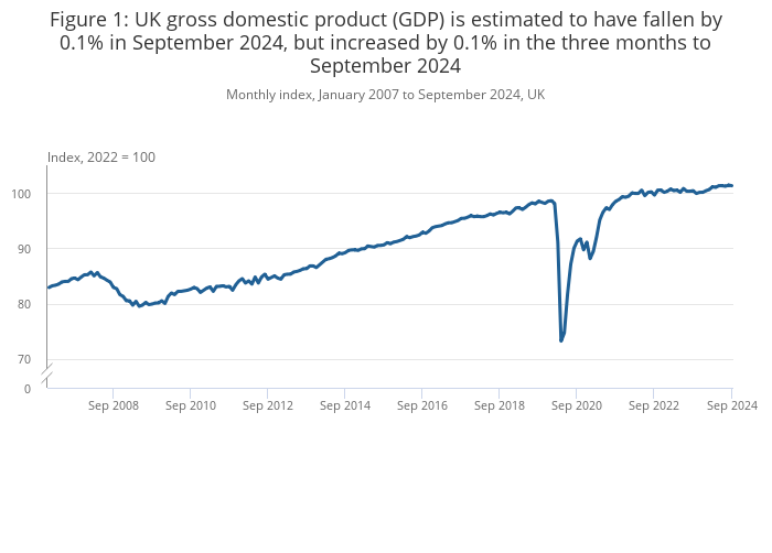 Monthly real gross domestic product (GDP) is estimated to have fallen by 0.1% in September 2024, following unrevised growth of 0.2% in August 2024 and an unrevised estimate of no growth in July 2024.