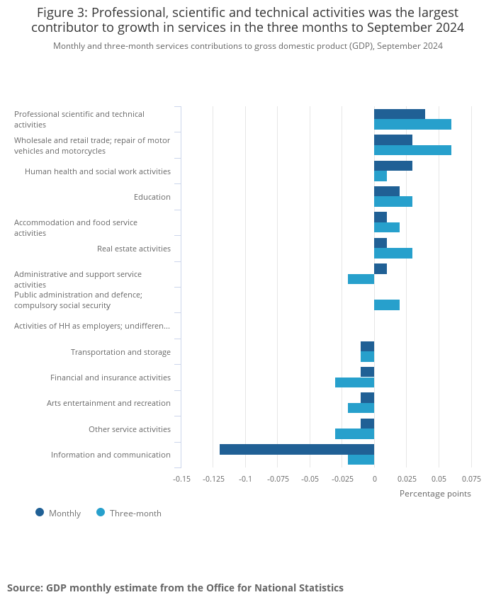 Professional, scientific, and technical activities was the largest positive contributor to the rise in services output in this three-month period, growing by 0.7% in the three months to September 2024. The next largest contributor came from wholesale and retail trade; repair of motor vehicles and motorcycles output, which increased by 0.6%. The largest negative contribution during the three months to September 2024 was financial and insurance activities which fell by 0.3%.