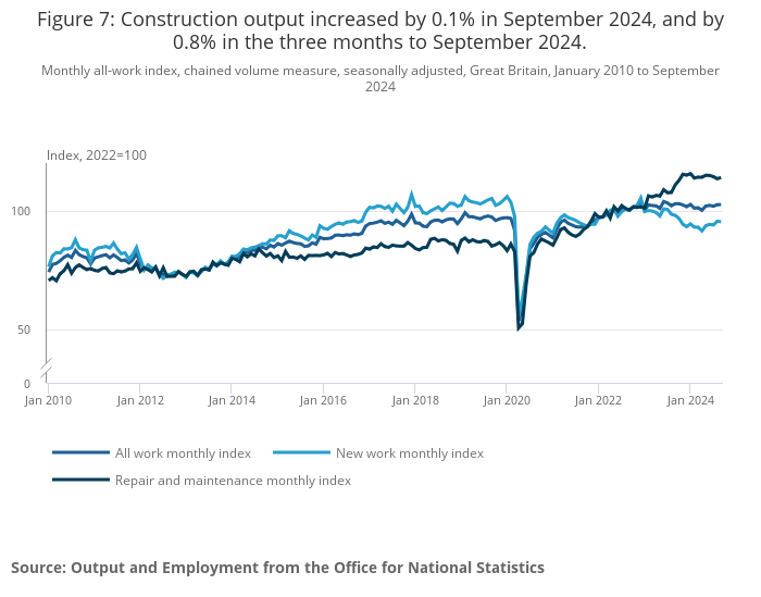 Figure 7: Construction output increased by 0.1% in September 2024, and by 0.8% in the three months to September 2024.