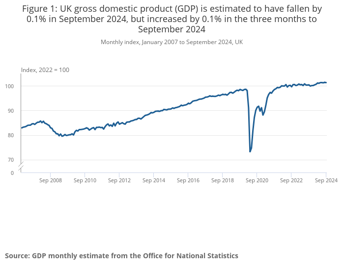 Figure 1: UK gross domestic product (GDP) is estimated to have fallen by 0.1% in September 2024, but increased by 0.1% in the three months to September 2024