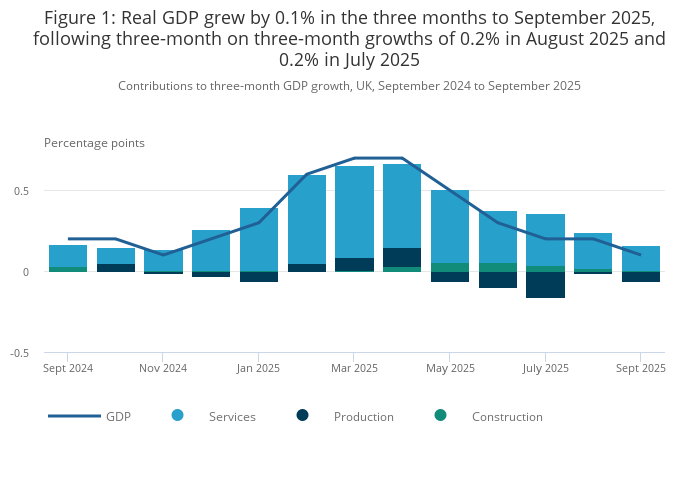Real gross domestic product (GDP) grew by 0.1%, following growth of 0.2% in the three months to August 2025 (revised down from growth of 0.3% in our previous publication).