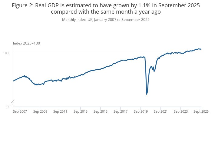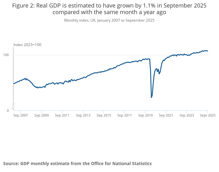 Compared with the same month a year ago, GDP is estimated to be 1.1% higher in September 2025.