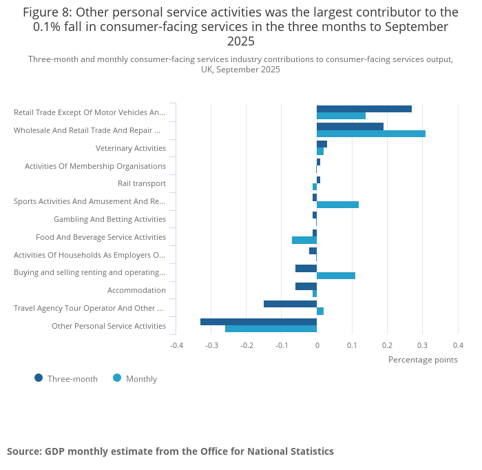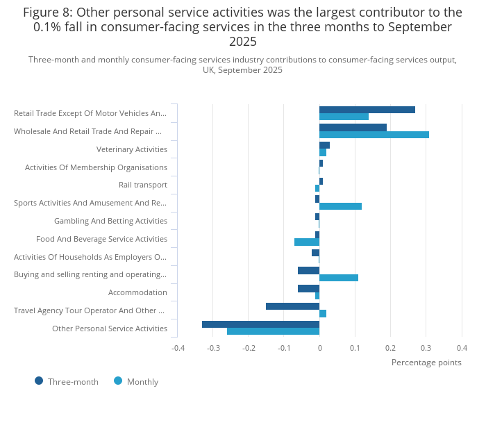 Download this chart Figure 8: Other personal service activities was the largest contributor to the 0.1% fall in consumer-facing services in the three months to September 2025