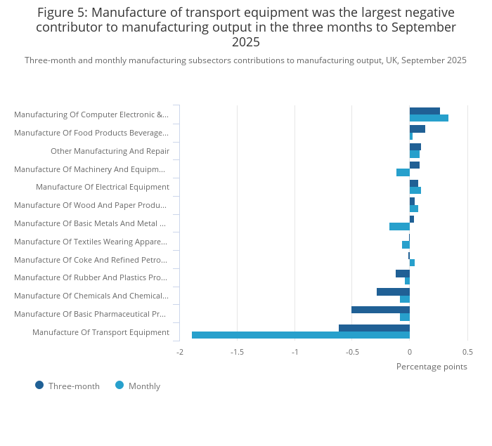 Download this chart Figure 5: Manufacture of transport equipment was the largest negative contributor to manufacturing output in the three months to September 2025