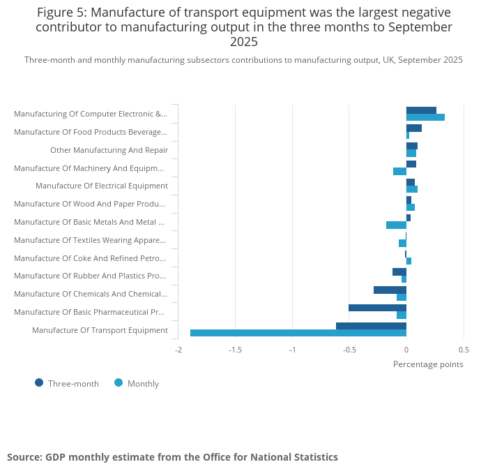 The manufacture of motor vehicles, trailers and semi-trailers fell by 28.6%; a negative contribution of 0.17 percentage points to the fall in GDP in September 2025.