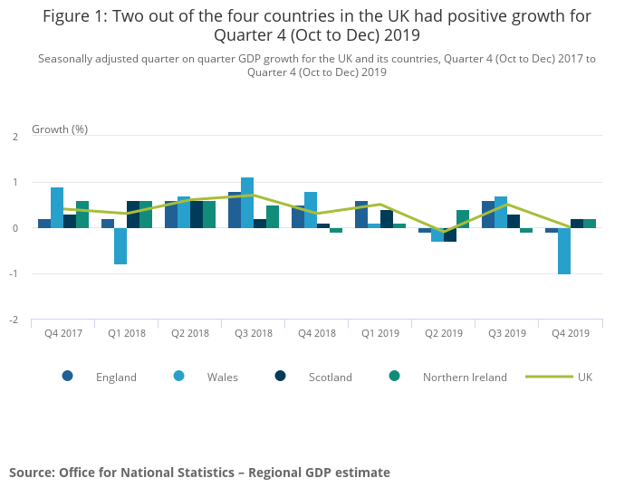Figure 1: Two out of the four countries in the UK had positive growth for Quarter 4 (Oct to Dec) 2019