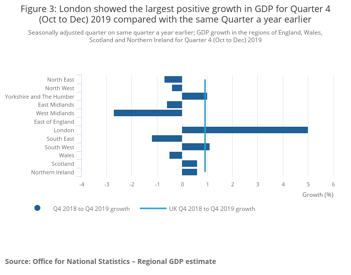 London showed the largest positive growth in gross domestic product (GDP) in Quarter 4 (Oct to Dec) 2019 when compared with the same quarter a year earlier, at 5.0%; this was more than double any other region.