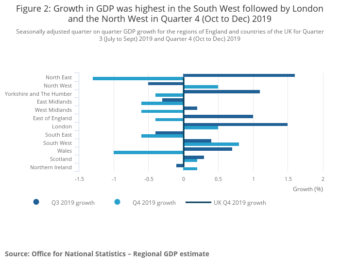 Of the nine English regions, the highest growth in Quarter 4 (Oct to Dec) 2019 was the South West with 0.8%.
