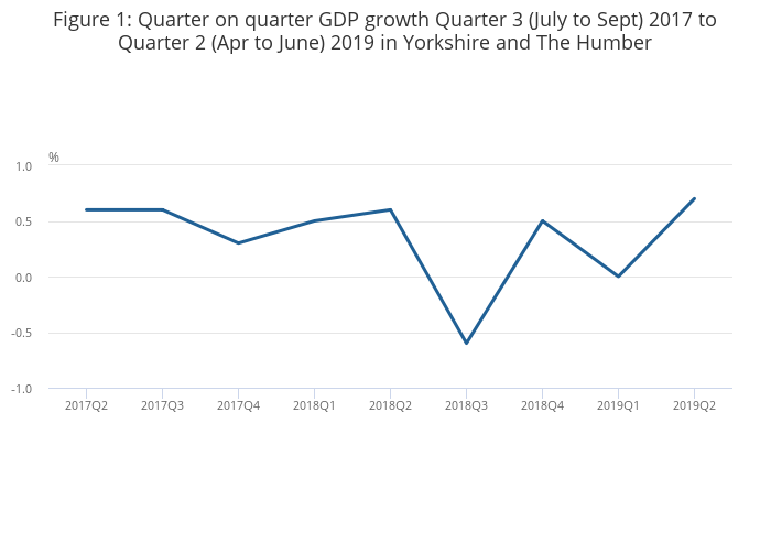 Image .csv .xlsGross domestic product (GDP) in Yorkshire and The Humber had growth of 0.7% in Quarter 2 (Apr to June) 2019, following flat growth in Quarter 1 (Jan to Mar) 2019. Compared with the same quarter of the previous year, GDP grew by 0.6%.