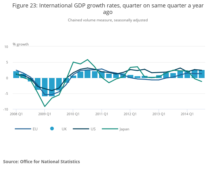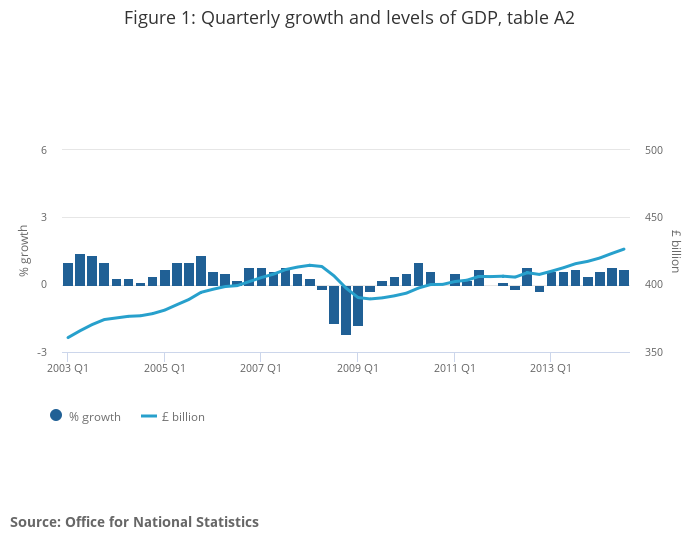 Image .csv .xlsThe latest figures for Q3 2014 show the UK recovery continuing, with GDP in real terms growing by 0.7% compared with the previous quarter, and by 2.6% between Q3 2013 and Q3 2014.