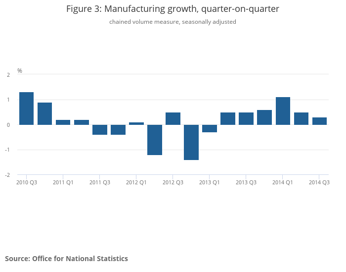 Production output increased by 0.2% in Q3 2014 compared with Q2 2014. However, there was a mixed performance within sub-industries. Output from mining and quarrying including oil & gas extraction fell by 1.6%, the largest fall within production, while water supply & sewerage fell by 0.3% on the quarter. Manufacturing (the largest component of production) and electric, gas, steam & air industries both rose on the quarter, increasing by 0.3% and 2.8% respectively. Electric, gas, steam & air industries made the largest positive contribution of 0.03 percentage points to GDP growth.