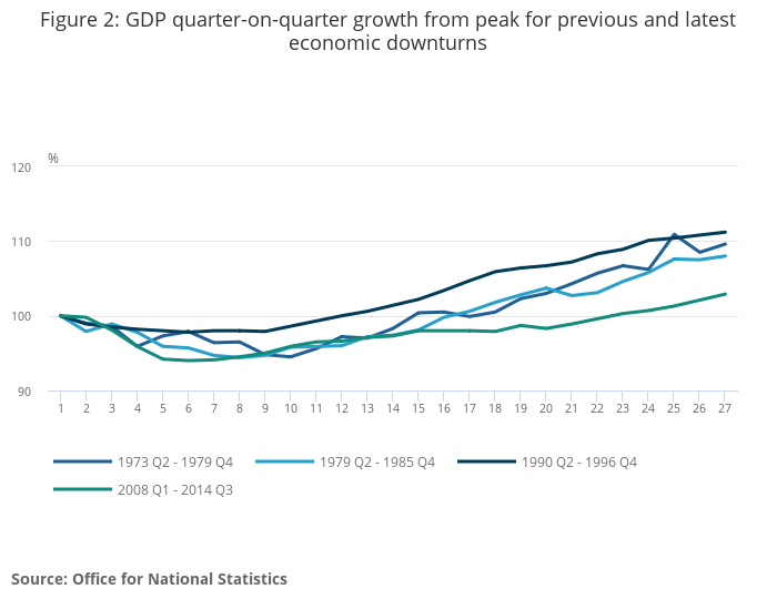 Figure 2: GDP quarter-on-quarter growth from peak for previous and latest economic downturns