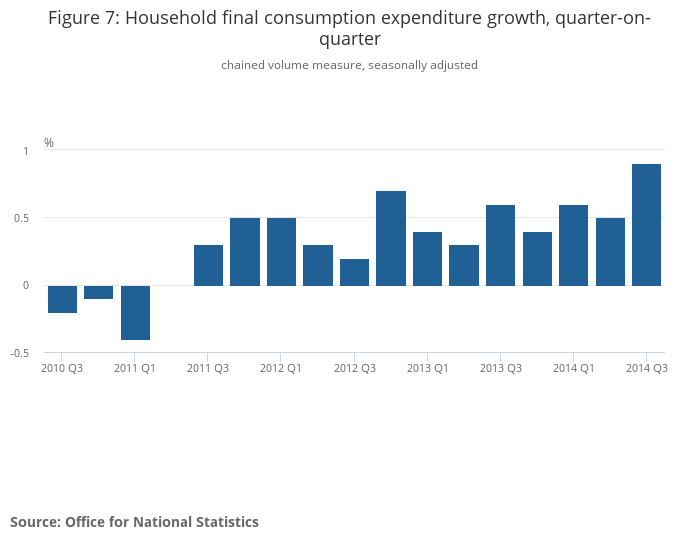 Household final consumption expenditure, when compared with the same quarter a year ago, has been rising each quarter since Q4 2011 and was 2.5% higher in Q3 2014 than in the same period a year ago.