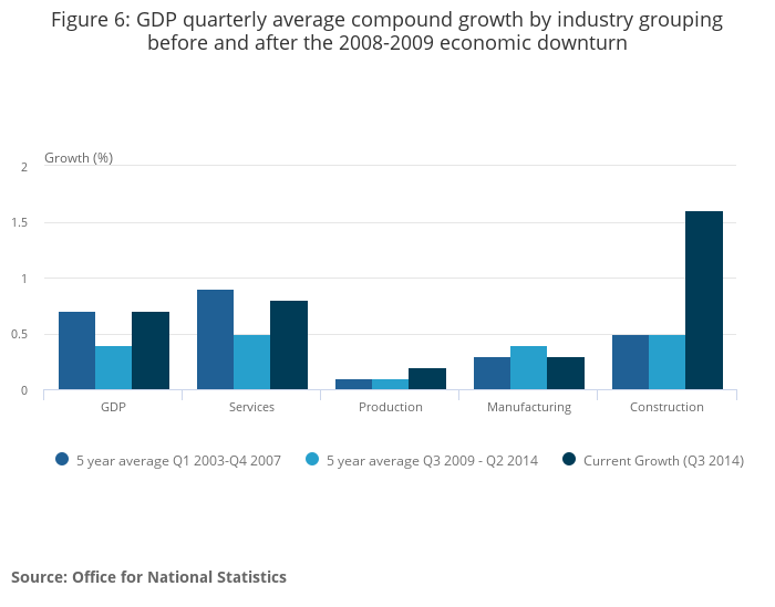 The five years following the economic downturn have experienced slower average compound GDP growth compared with the period before the downturn; this pattern is also reflected in the services industry. In the most recent period (Q3 2014) the production and construction industry have both outperformed the pre-downturn long run average. It should be noted that the third column, current quarterly growth rate, is based on only one data point and users should use caution when making direct comparisons with the long run averages.